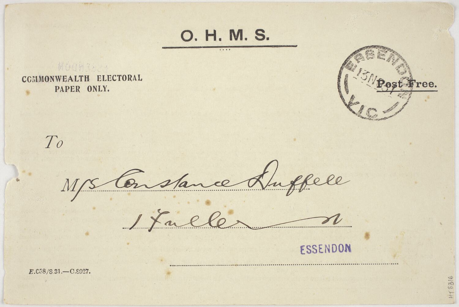 Card of acknowledgement of receipt of electoral claim, addressed to Constance Duffell, I Fuller St Essendon; enrolled in Essendon & Maribyrnong, 11/11/1931