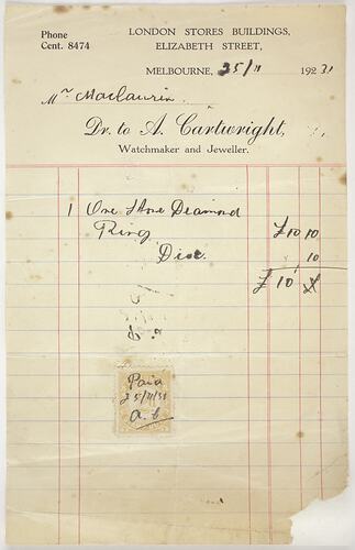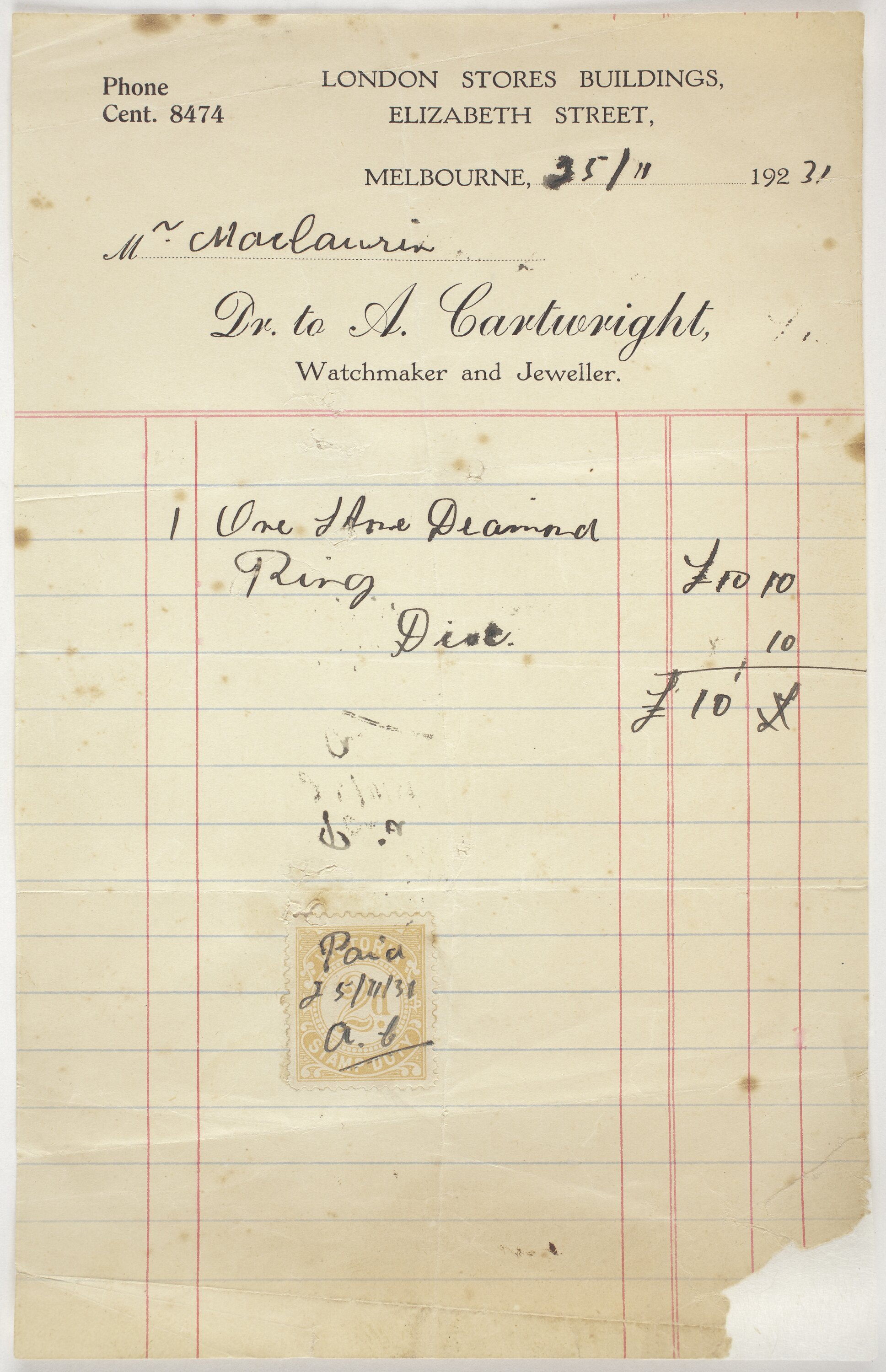 Receipt for purchase of a diamond ring by Mr Mclaurin from A Cartwright Watchmaker and Jeweller, Elizabeth St Melbourne, 25/11/1931. Cost of 10 pounds.
