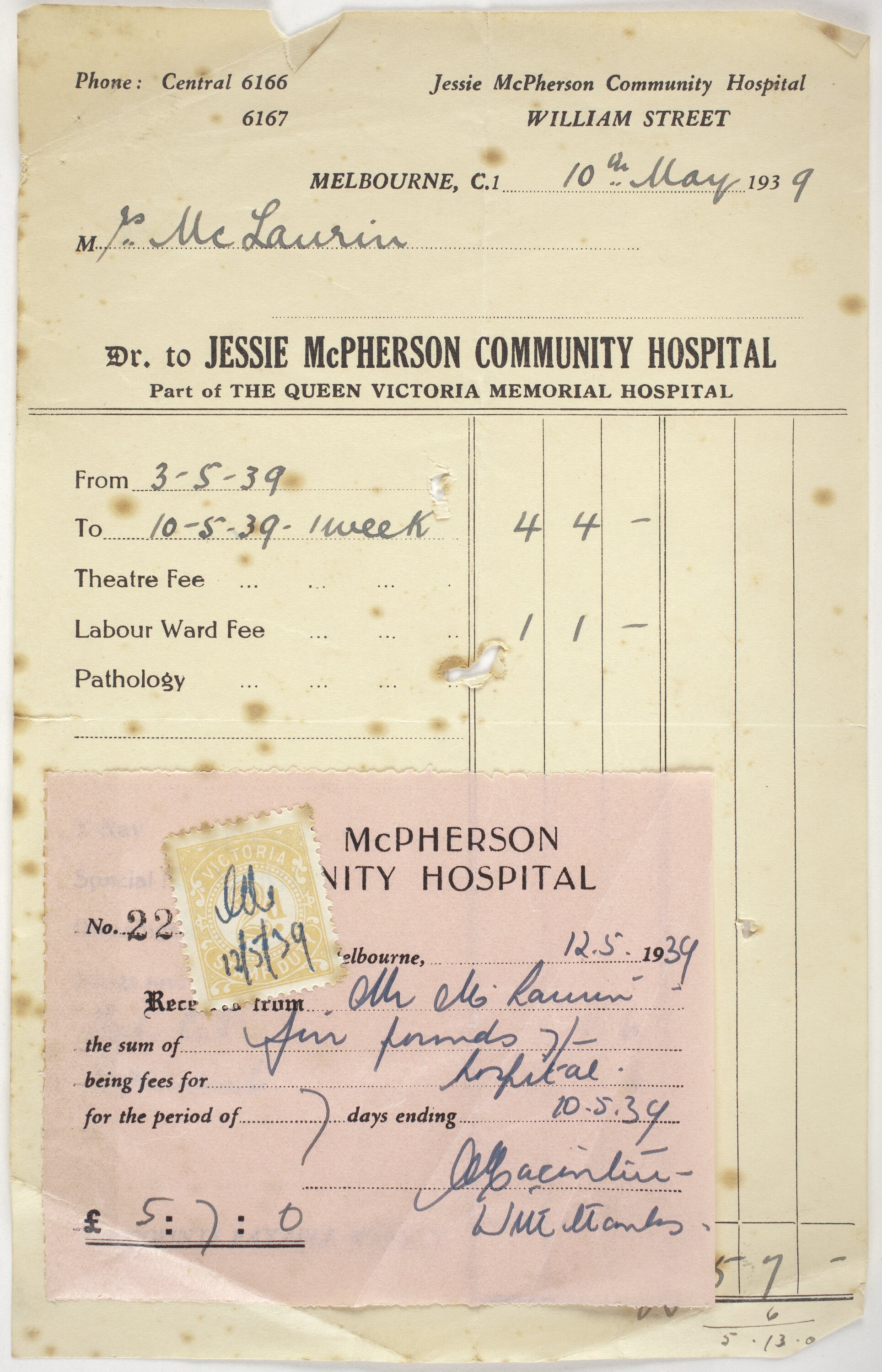 Paper invoice with pink paper receipt attached, made out to Mrs Maclaurin from Jessie McPherson Community Hospital (part of Queen Victoria Memorial Hospital) William St Melbourne, dated 10 May 1939, for childbirth fees and one week stay at 5 pounds and 7 shillings.