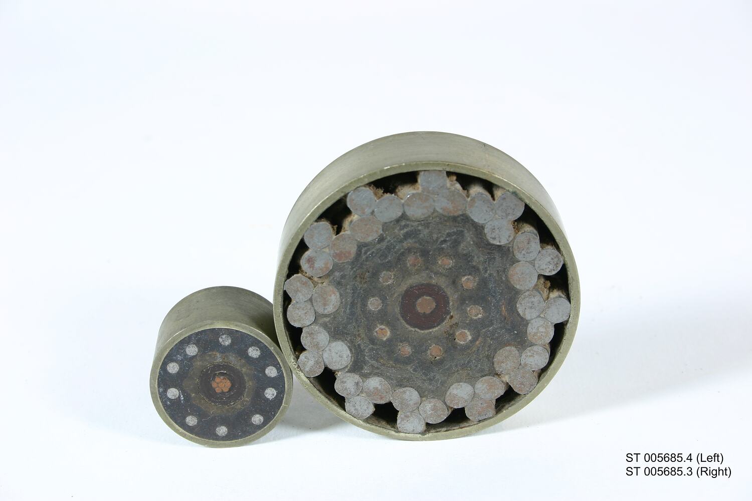 This object is an unused sample of the shore end cable, showing the cross-section. The shore end was more heavily armoured than the main cable because of the greater possibility of damage close to shore by wave action and fishing and anchoring activities.