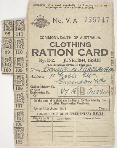 No. V.A 735747/COMMONWEALTH OF AUSTRALIA./CLOTHING/RATION CARD/Rg. D.2. JUNE 1944, ISSUE
