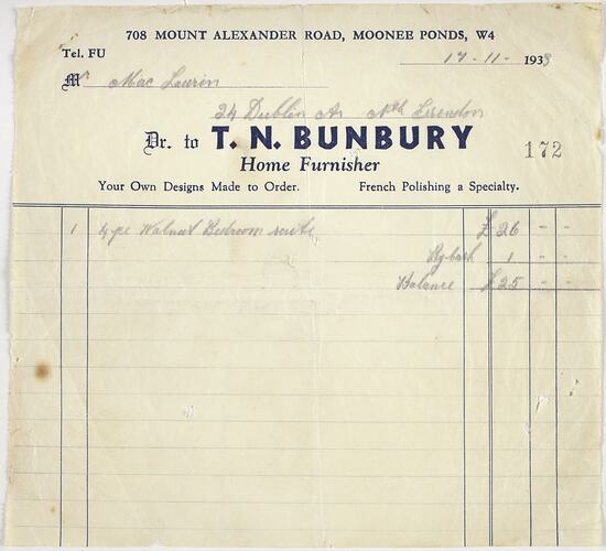 Paper receipt of purchase made out to Mr Maclaurin from TN Bunbury Home Furnisher, Moonee Ponds, dated 17 November 1933, for a 4 piece walnut bedroom suite, at 26 pounds.