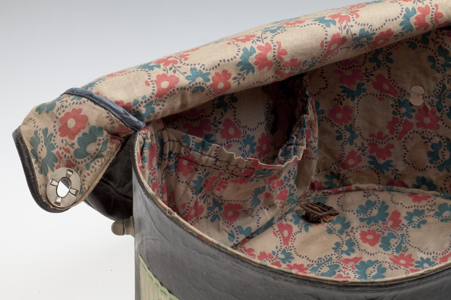 Oval shape, black box with soft canvas lid and base; cardboard sides with floral lined interior; clips at 3 sides; 3 P&O baggage labels from the 1950s (plus evidence of an earlier label), filled in with 'S. Mclaurin' and the 'Arcadia'