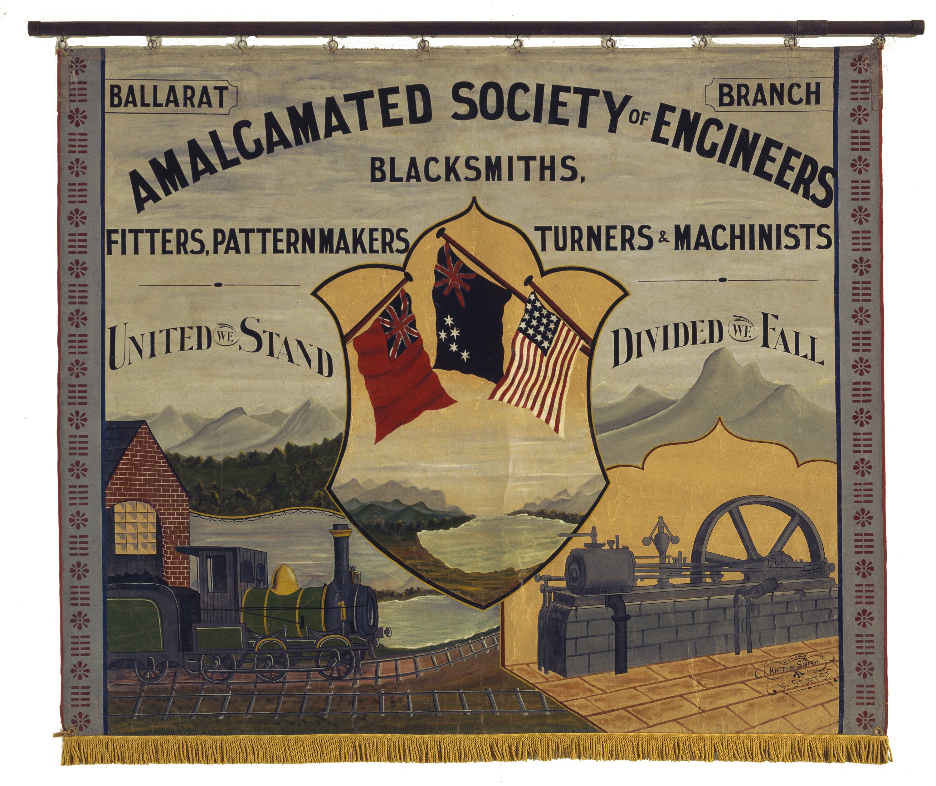 This canvas banner was painted in 1890 by Kift & Smith for the Amalgamated Society of Engineers, Blacksmiths, Fitters, Patternmakers, Turners & Machinists, Ballarat Branch.