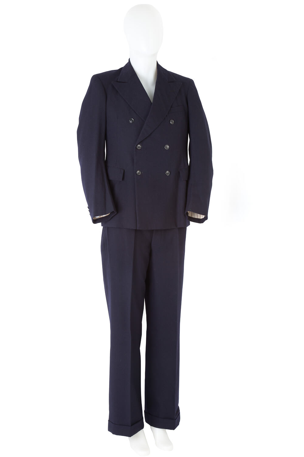 Navy blue wool suit pants, purchased in Wauchope New South Wales in 1944. Part of a suit worn by Albanian immigrant Pandi Thomas for his wedding to Artemissia Hari, which took place in Bagnoo New South Wales in 1944. Pandi and Artemissia's marriage was arranged through the business contacts of Pandi's brother, who introduced Pandi to Artemissia's father. After Pandi and Artemissia's father had discussed the marriage prospect, the couple met and Artemissia agreed to the marriage, as she was culturally expected to do. They were married in a Greek Orthodox wedding ceremony at Artemissa's family farm house with a priest brought in from Sydney. The couple honeymooned in Kempsey, New South Wales and then returned to Shepparton, where Pandi was living with his brother. They had five children and died within seven weeks of each other in 1995.