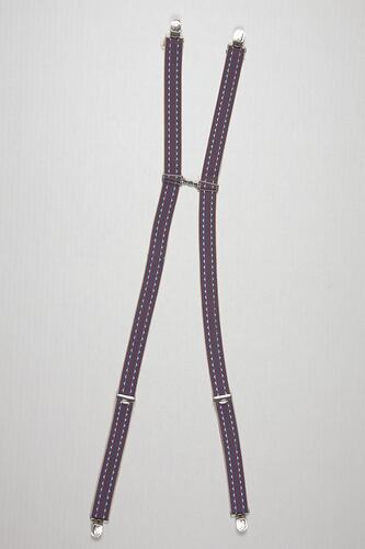 Braces, purchased in Wauchope New South Wales in 1944. Part of a suit worn by Albanian immigrant Pandi Thomas for his wedding to Artemissia Hari, which took place in Bagnoo New South Wales in 1944. Pandi and Artemissia's marriage was arranged through the business contacts of Pandi's brother, who introduced Pandi to Artemissia's father. After Pandi and Artemissia's father had discussed the marriage prospect, the couple met and Artemissia agreed to the marriage, as she was culturally expected to do. They were married in a Greek Orthodox wedding ceremony at Artemissa's family farm house with a priest brought in from Sydney. The couple honeymooned in Kempsey, New South Wales and then returned to Shepparton, where Pandi was living with his brother. They had five children and died within seven weeks of each other in 1995.