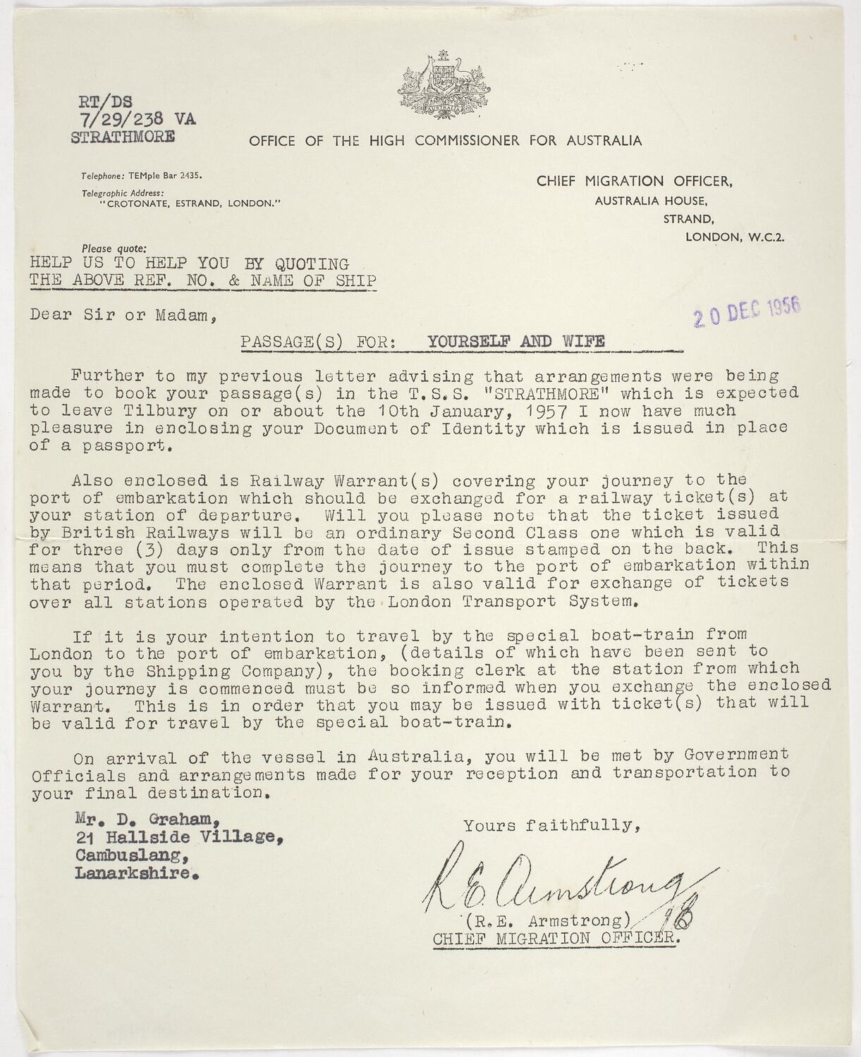 Letter from the Office of The High Commissioner for Australia to Daniel and Christina Graham, dated 20 December 1956. The letter advises the Grahams that their Documents of Identity are issued and enclosed, as are their Railway Warrants for British travel to their port of departure, and that assistance for reception and transportation upon their arrival in Australia would be arranged. Daniel and Christina Graham migrated to Victoria from Scotland in 1957. They arrived in Melbourne on the 'Strathmore' on 12 February 1957. They had three children, and settled in Moe where Daniel found work with the SEC.
