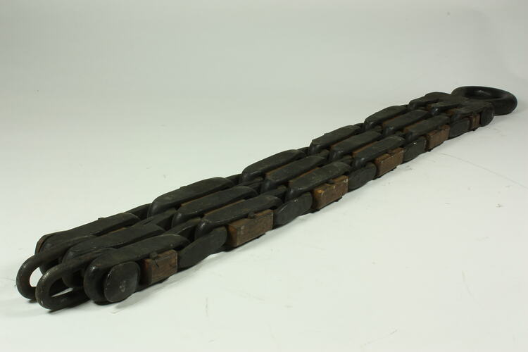 Black metal triple link chain with wooden spacers, pitch 14cm, used for mining purposes.