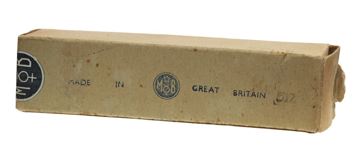 Packet for drug Tryparsamide. Made by Pharmaceutical Specialties [May & Baker] Ltd., Dagenham, England, circa 1925, by arrangement with the Rockefeller Institute for Medical Research. Kept in a mental health hospital pharmacy and administered to patients at a mental health hospital in Victoria, Australia. Tryparsamide (trade name) is sodium N-phenylglycineamide-p-arsonate, a compound containing 25% arsenic. Used in conjunction with malarial fever therapy to treat tertiary neuro-syphilis in patients diagnosed with General Paralysis of the Insane (GPI), having been originally developed for the treatment of human African trypanosomiasis, or African sleeping sickness. GPI was found to be caused by the spirochaete bacterium Treponema pallidum and later treated effectively with penicillin.