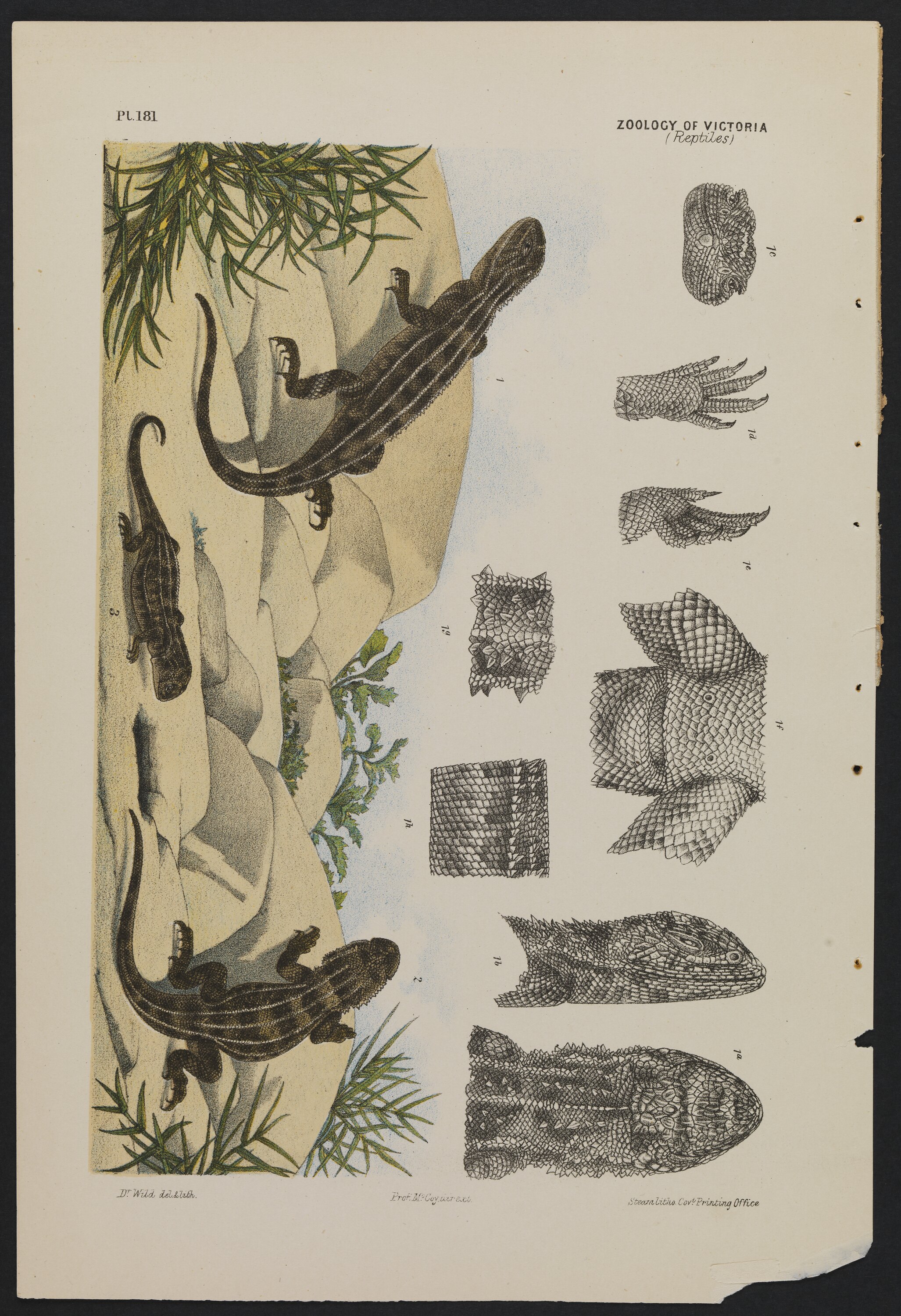 Series of illustrations, proofs and prints of the Grassland Earless Dragon, Tympanocryptis pinguicolla, by John James Wild, for Plate 181 in The Prodromus of the Zoology of Victoria. McCoy originally identified this lizard as the White-streaked Earless Lizard, Tympanocryptis lineata, a species found in the dry mallee regions of western Victoria.