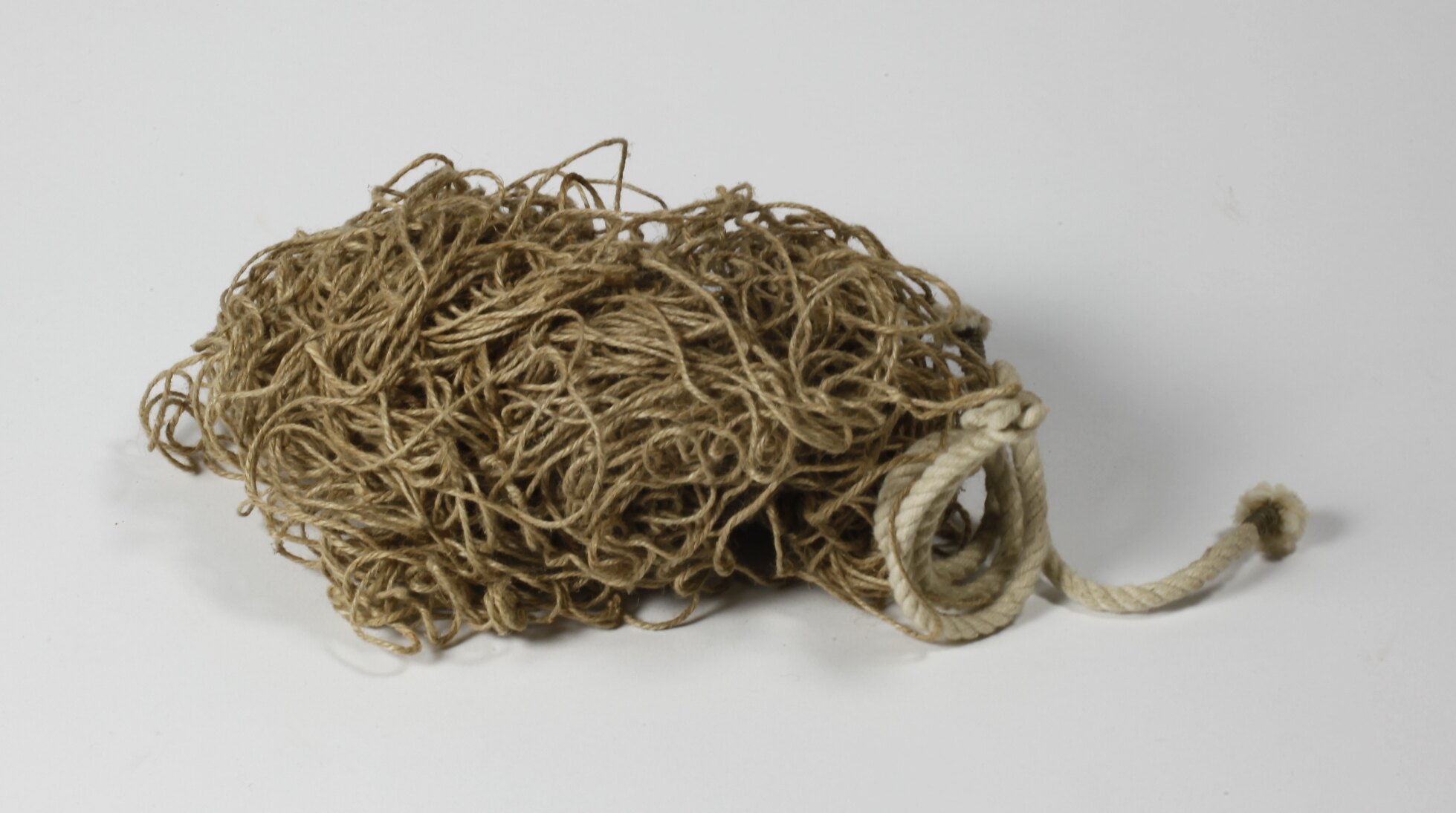 Loose bundle of brown twine and a short length of white cord with twine around ends.
