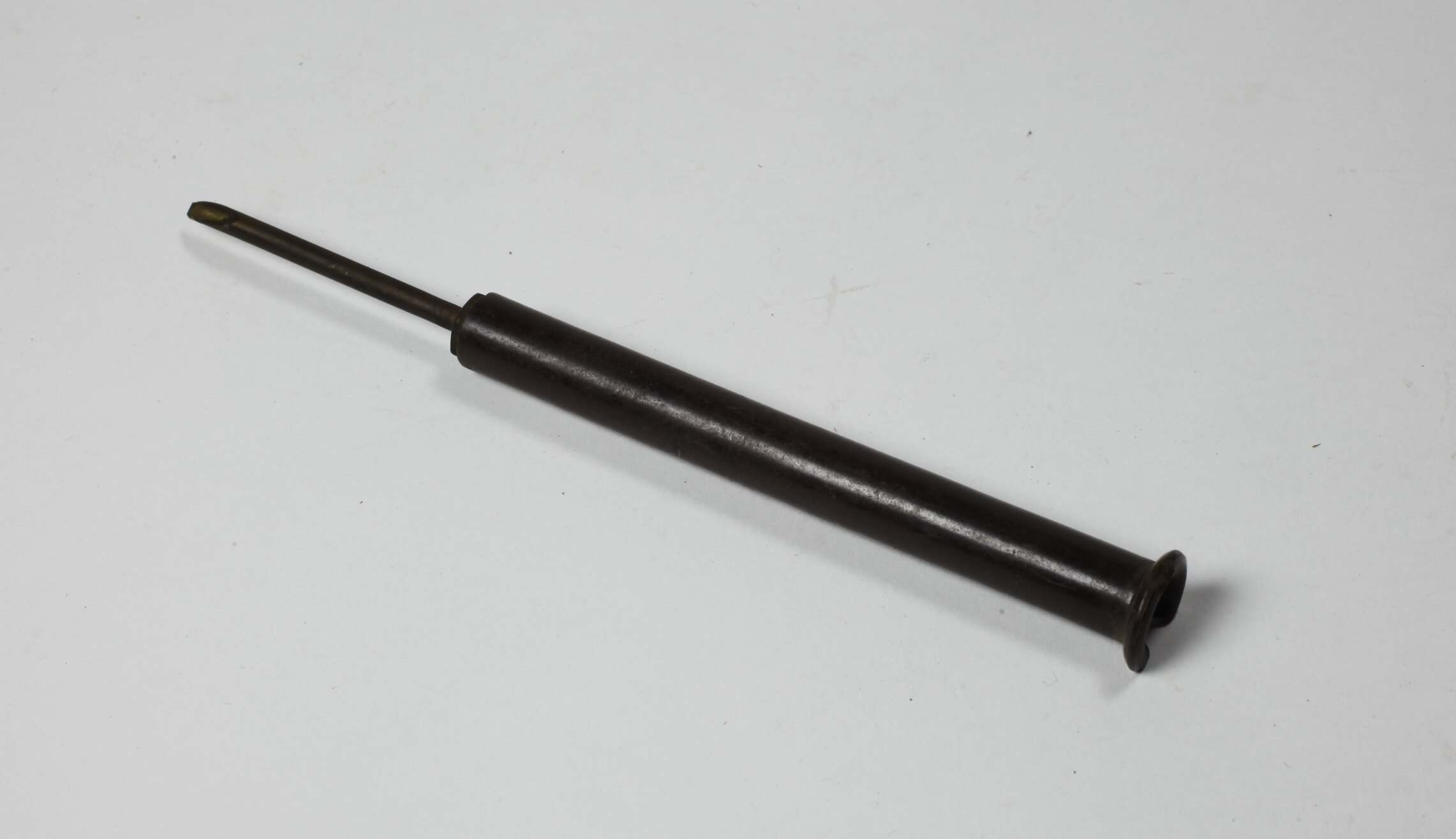 Brass hollow needle screwed into a hollow bakelite handle.