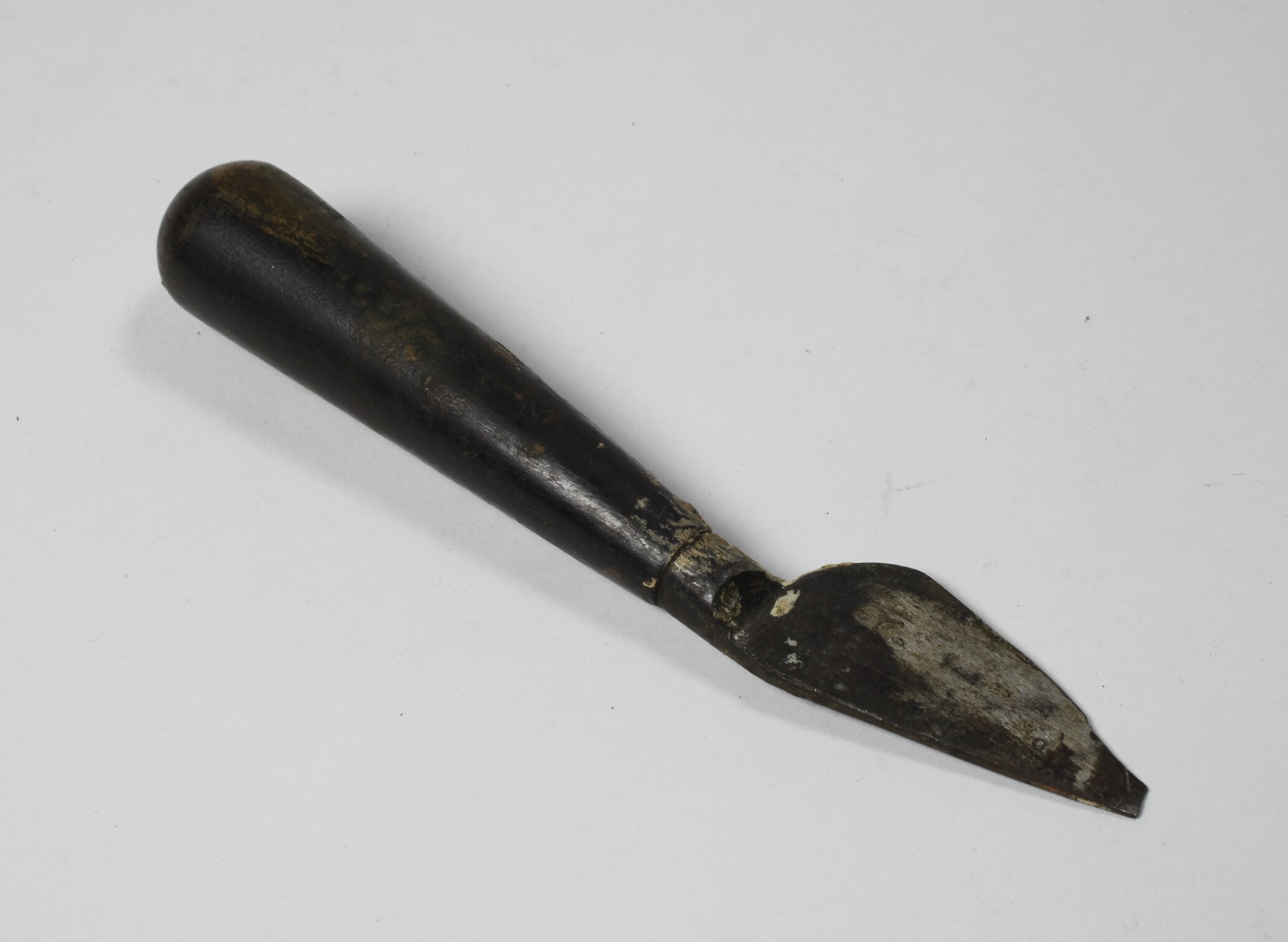 Wooded turned handle attached to steel blade. May have been made from a broken blade as there is a partial inscription on the blade.