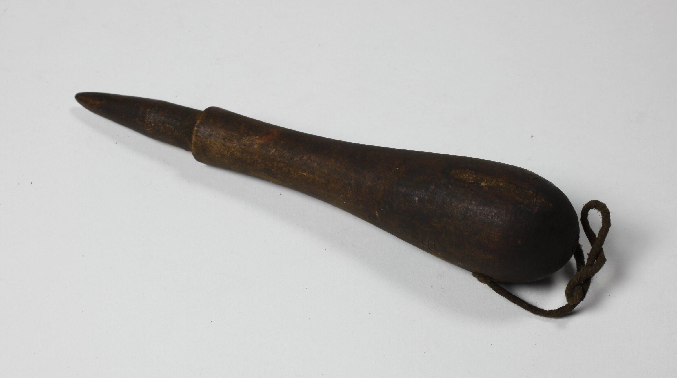 Turned tapered wooden with string attached.