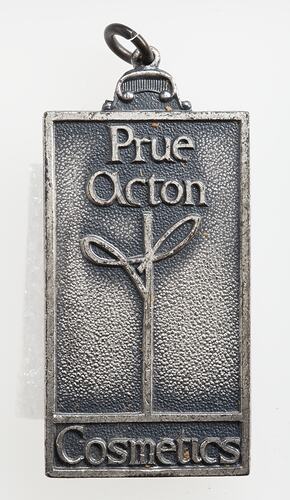 Cast metal badge, imprinted with the words `Prue Acton Cosmetics' and the company's logo on a textured background. On the back is impressed the maker's name `K. G Luke, Melbourne', and a large metal pin and clasp. On the top of the badge is a small metal loop securing a large metal link (for an unknown purpose.)