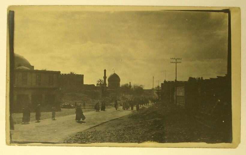 Black and white photograph, dating from World War I, showing people walking down a road in Baghdad.