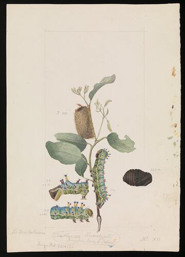 Unpublished watercolour, pencil & ink illustrations by Arthur Bartholomew of the larvae (D12) and pupae (D222) of the Emperor Gum-Moth, Opodiphthera eucalypti (originally identified as Antheraea eucalypti), and their host plant. The caterpillars were collected from near Melbourne, and were grown in captivity until the moths emerged - see PZD 221 and PZD 226.