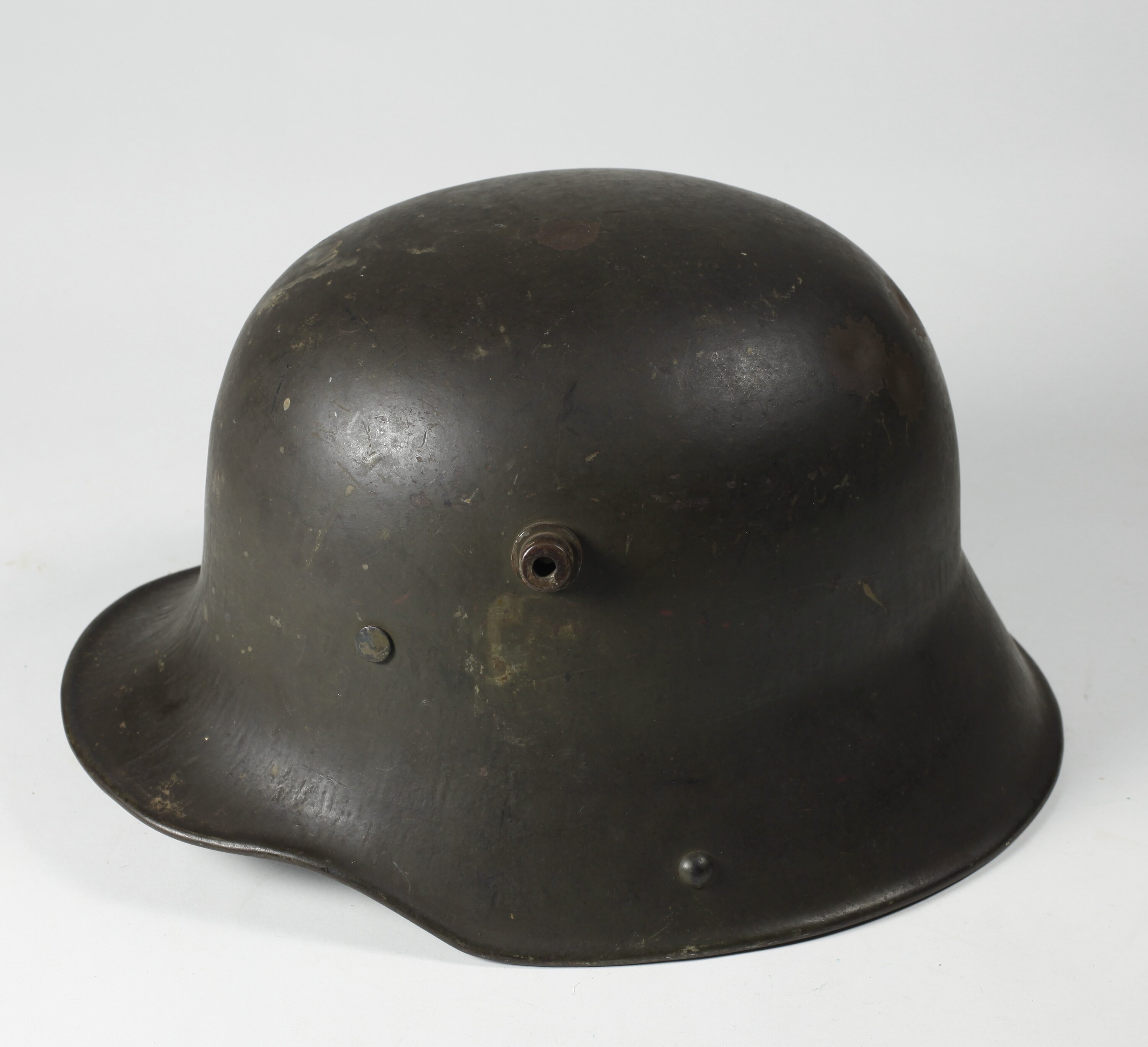 German World War I 'coal scuttle' style M1916 steel helmet with padded liner and side lugs for attachment of extra helmet armour.