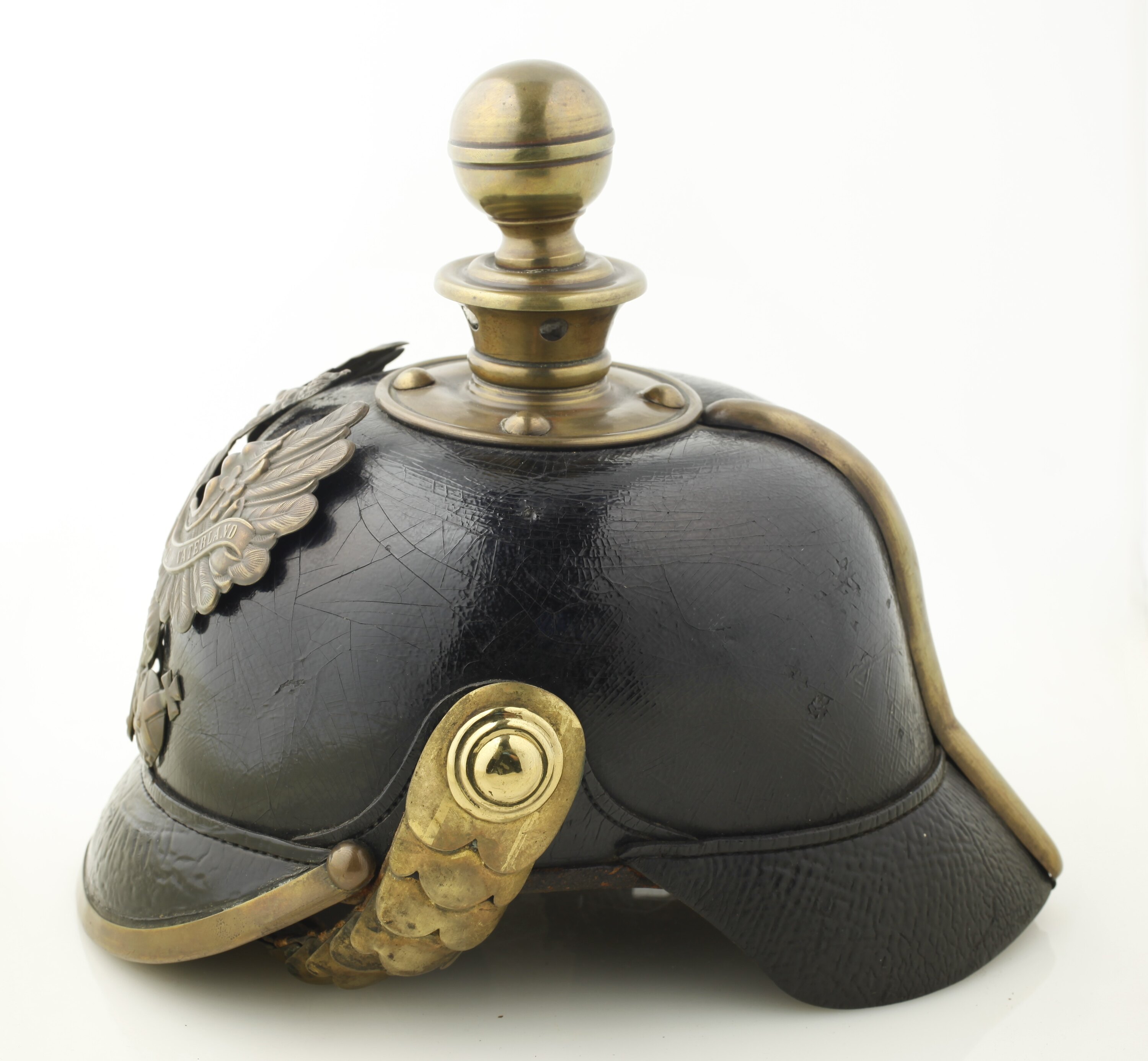 Black leather covered helmet with brass fittings and chin strap. The top of the helmet has a brass orb. The front has a crowned eagle holding a scepter in one foot and an orb with a cross in the other. Text in German on the badge. Leather lining. Text on the underside of both brims.