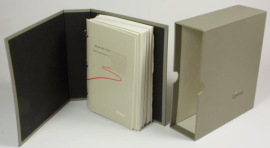 A compact three ring grey binder stored in a grey cardboard box. Contains several individual pamphlets; approximately 300 sectioned pages in total. External cover of binder and storage box has the corporate logo of Corvus Systems in lower right corner. White pages with extensive printed black text, illustrations and diagrams. Contains one sheets of note paper with handwritten text.