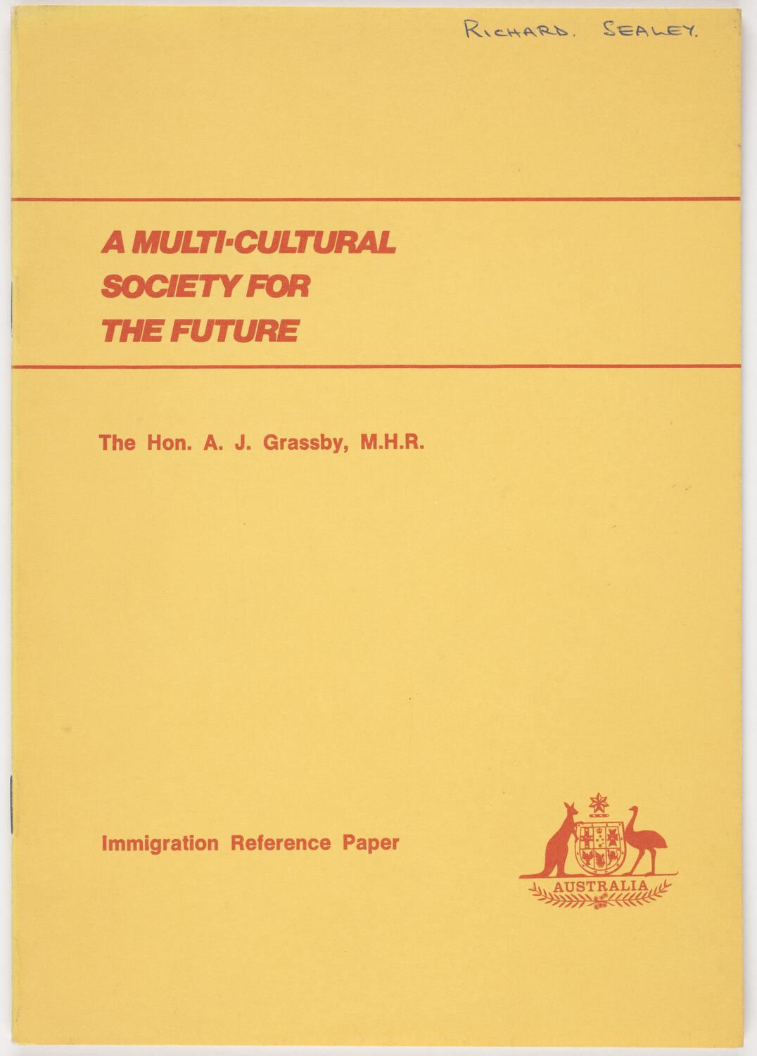 Text, front cover: A MULTI-CULTURAL/SOCIETY FOR/THE FUTURE/The Hon. A.J. Grassby, M.H.R./Immigration Reference Paper.