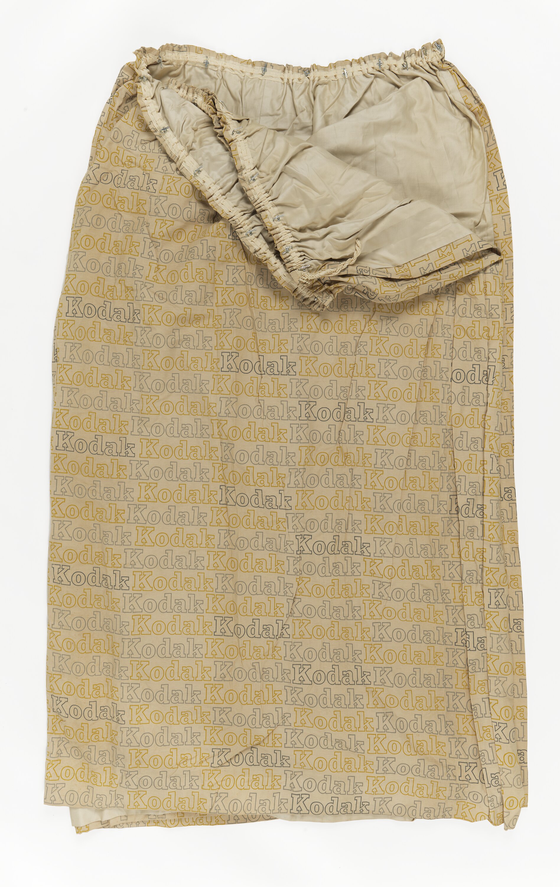 Two curtains. Both are cream coloured heavy cotton with 'Kodak' printed repeatedly in rows in orange, grey and dark grey outline. Both curtains are fully lined with cream coloured heavy cloth and have round weights inserted at each bottom corner. Both curtains still have small metal hooks used to hang attached to the top edge which is gathered using thick cotton string.