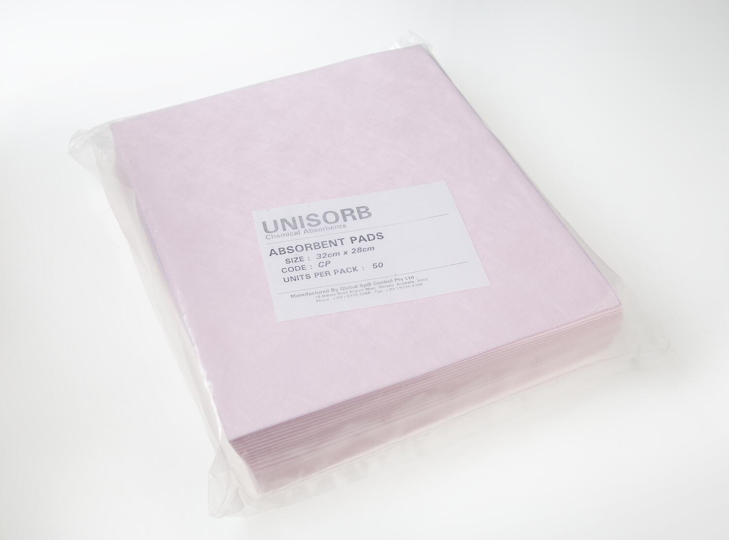 Package slip, printed, black ink: 'UNISORB / CHEMICAL ABSORBENTS / ABSORBENT PADS / SIZE: 32 CM X 28CM / CODE: CP / UNITS PER PACK: 50 / MANUFACTURED BY GLOBAL SPILL CONTROL PTY LTD / 16 HALSEY ROAD AIRPORT WEST VICTORIA AUSTRALIA 3042 / PHONE (03) 9335-5366, FAX (03) 9335-4399'