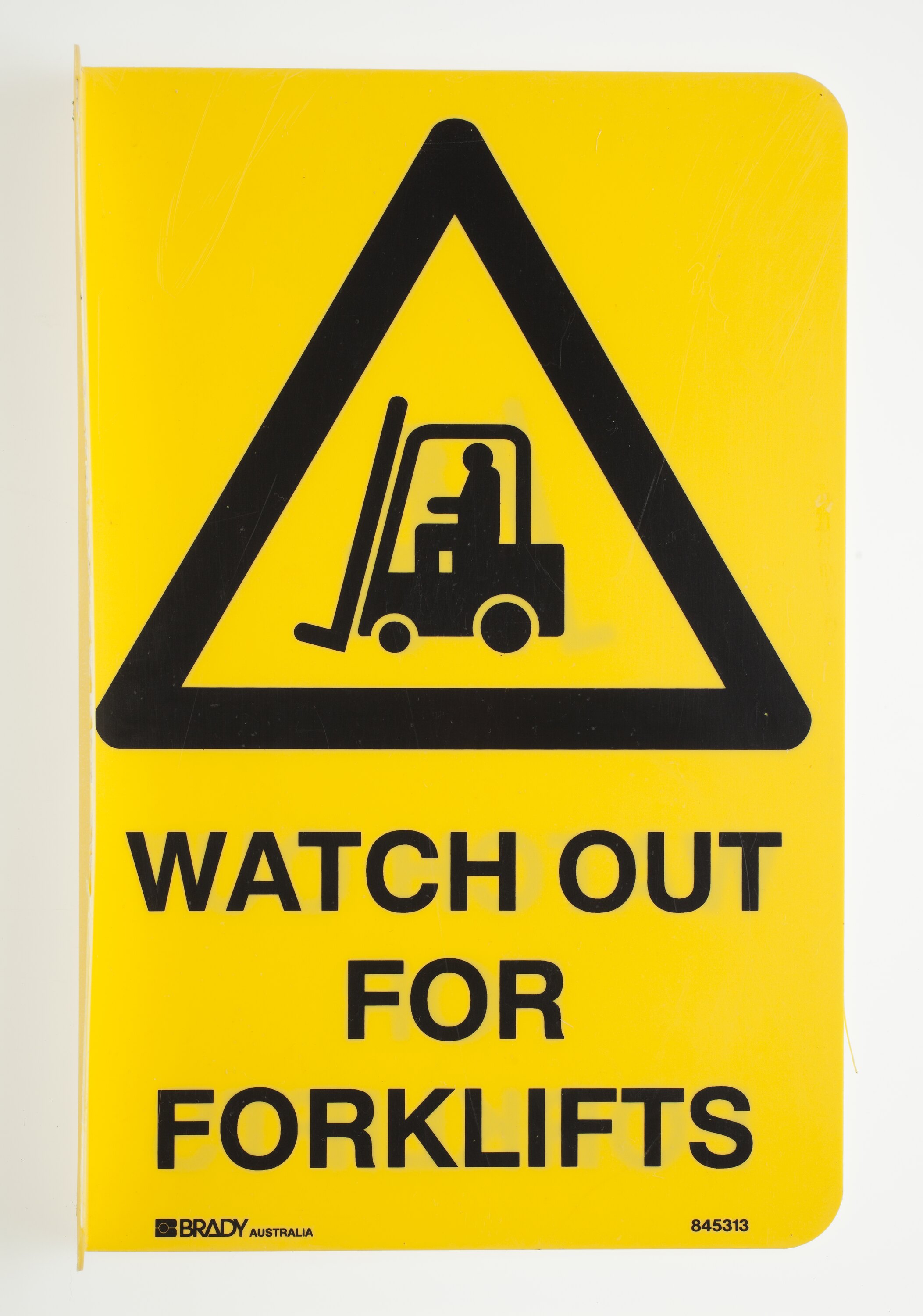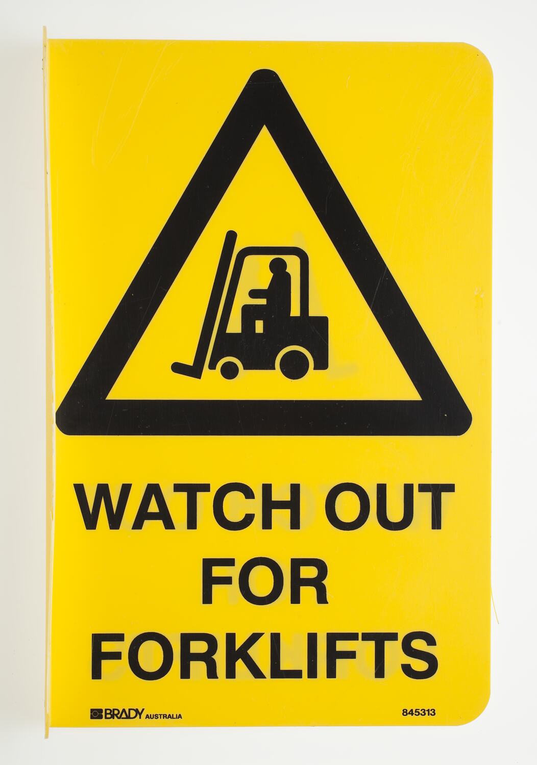 Rectangular yellow plastic sign with black printed inscription and diagram of a forklift. Has 2 holes for attaching to a wall on side bent at a right angle.