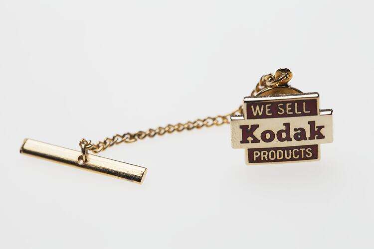 Gold metal pin with red colouring on the face at the top and bottom with the logo Kodak in red in the gold centre of the pin. Removable clasp on back attached to a fine gold chain to a gold anchor bar. The plastic box is clear on top, black on the bottom and has degrading black foam covering the cardboard insert.