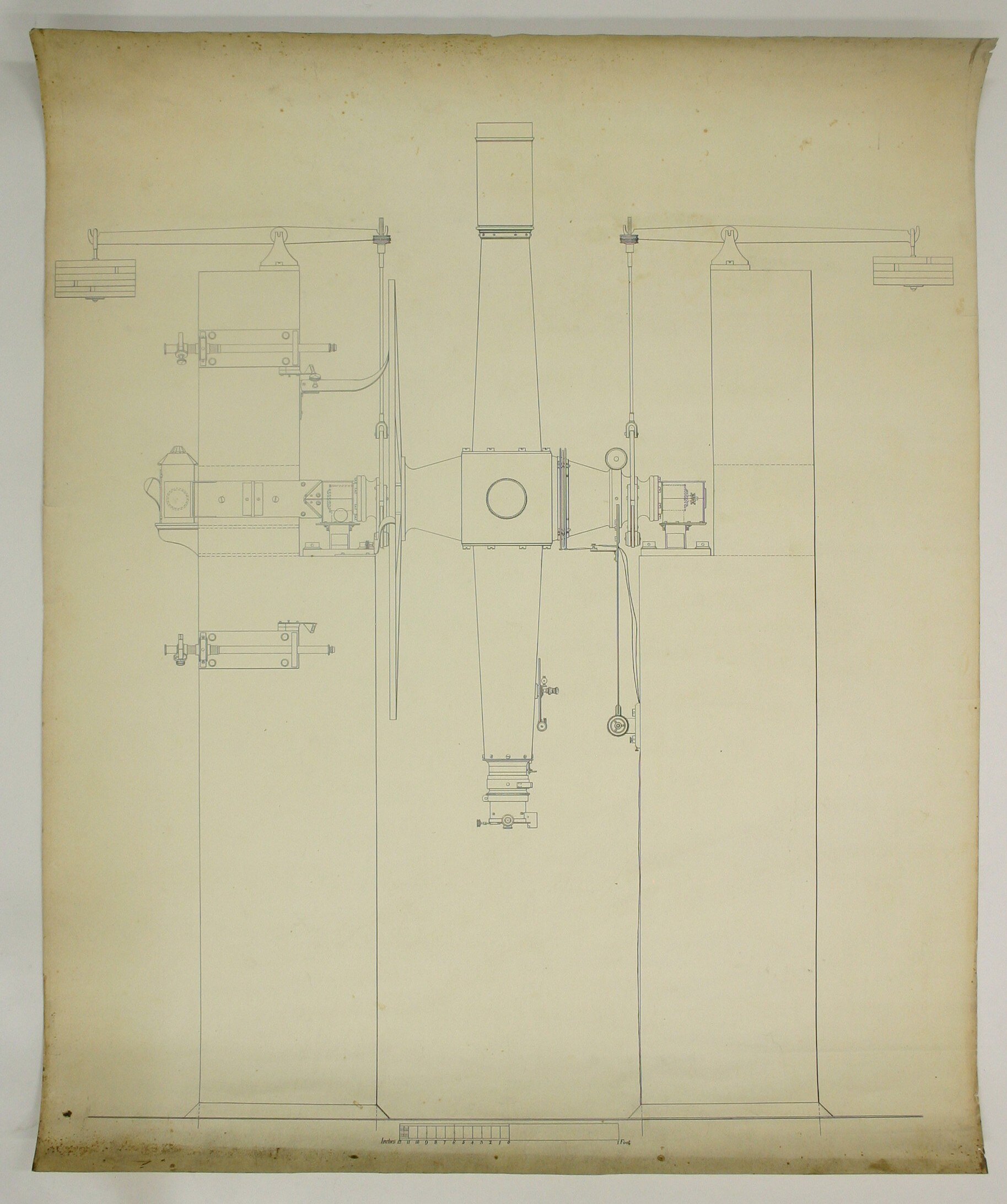Drawing on off-white paper in black ink showing the side elevation of an 1861 6 foot Transit Instrument by Troughton & Simms, London. The instrument was erected at the Williamstown Observatory in 1861 and re-erected at the Melbourne Observatory in 1863. The drawing fills the page and comprises various mechanic components. A scale is printed below. The paper is foxed, with traces of mould around the edges. Handwritten inscriptions in pencil on the reverse.