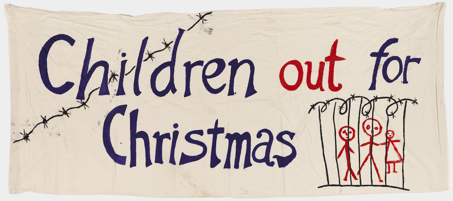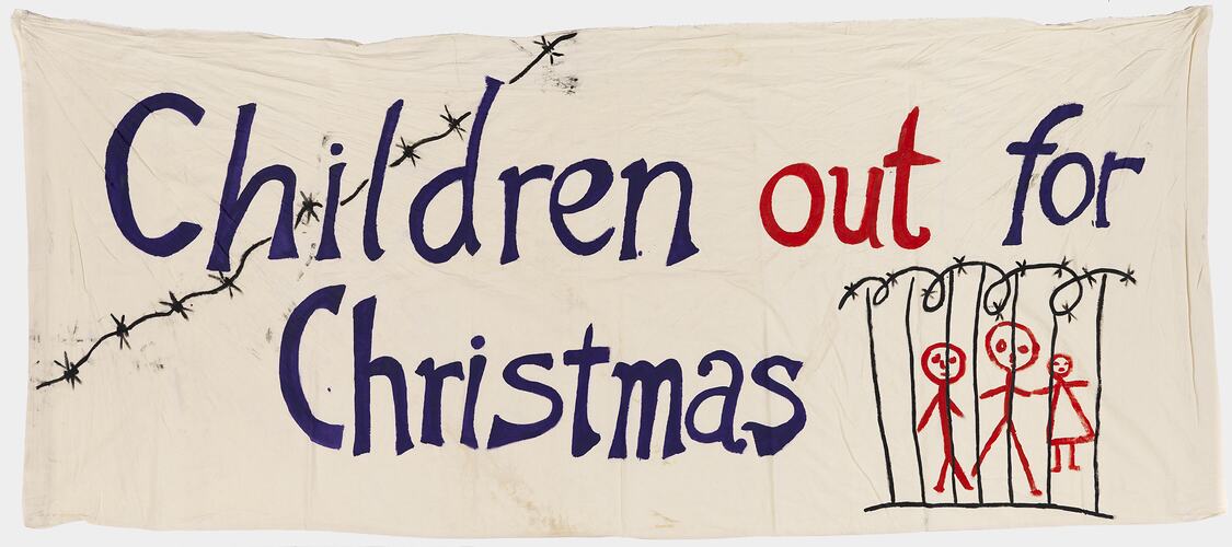 Banner 'Children Out for Christmas' made by the Refugee Action Collective around October 2004 and used at various protest rallies. The Refugee Action Collective has grown out of a national grassroots protest movement in response to the treatment of refugees and mandatory detention. First established in 2000, it gained momentum during the Tampa crisis in August 2001. Banners such as this one were designed and painted at Trades Hall and all go through several approval processes.