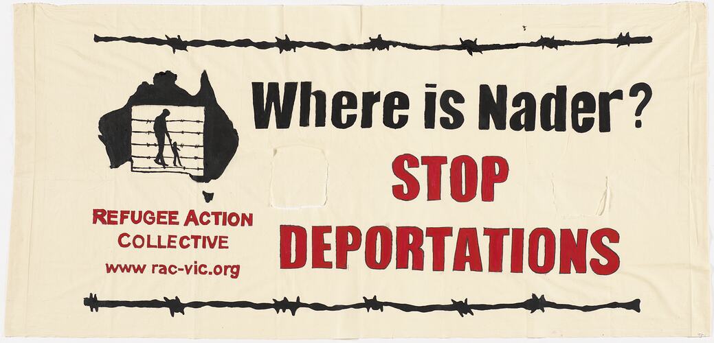Banner with the slogan 'Where is Nader? Stop Deportation' it was made by the Refugee Action Collective in 2002 for use at a rally where the deportation of Iranian asylum seeker Nader Sayadi was a particular issue.