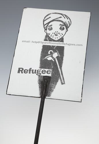 White printed paper attached to board with black painted handle. Side 1 reads: 'Spare Rooms for Refugees' with image of a house. Organization information inscribed: 'Spare Rooms for Refugees. www.SpareRoomsforRefugees.com. email: help@ SpareRoomsforRefugees.com. Phone: (03) .(covered by handle)6731'. Side 2 reads: 'Refugee. SpareRoomsforRefugees.com.' and drawn image of man in turban with walking stick.