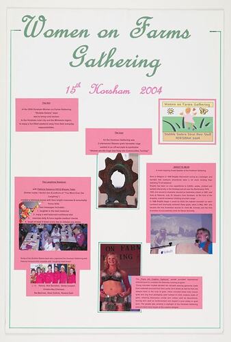 History board created by the 2004 Horsham Women on Farms Gathering organising committee, illustrating the highlights from the gathering.