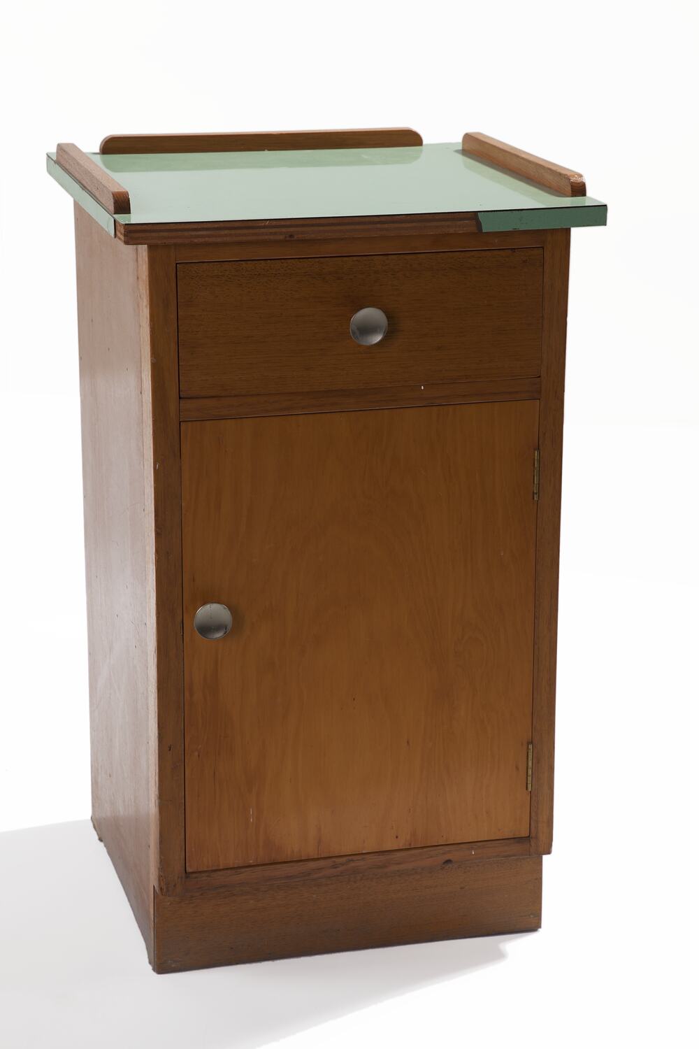 Wood cabinet with green laminate top and metal handles. Has one drawer and one cupboard with a shelf.