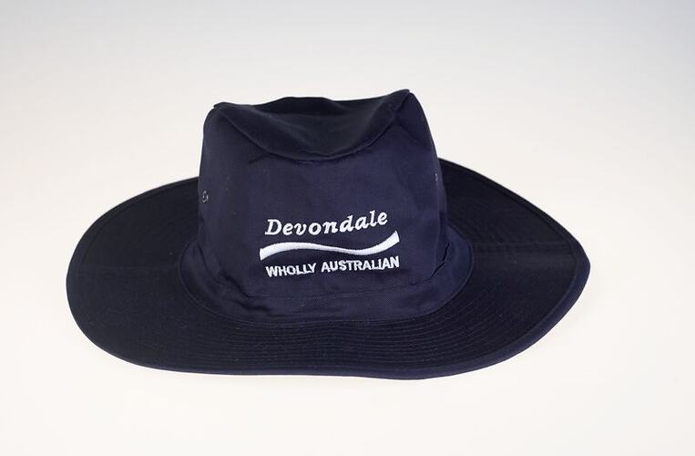 Hat with brim and logo worn by a participant at the 2003 Yarram Women on Farms Gathering. This hat was donated by one of the Gathering's sponsors, Devondale.
