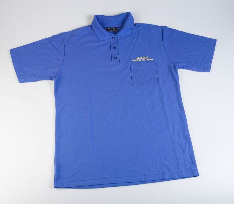 Blue polo neck shirt with logo. This shirt was worn by members of the 2003 Yarram Women on Farms Gathering organising committee. During the weekend all members of the committee wore blue shirts, blue scarves and yellow name tags so that they could be easily recognisable to Gathering attendees. Reflecting on the experience of organising the 2003 Yarram Gathering, the committee wrote in the 2003 Yarram Gathering Program: 'We are fortunate to have a committee and it is a pleasure to work together. All members have worked hard and learnt much. Each has been prepared to step well out of their personal comfort zone to achieve this weekend. We are proud of our achievements and do hope all those attending have a pleasant weekend. Committee members can easily be identified by their blue shirts and blue scarves and yellow name tags'.