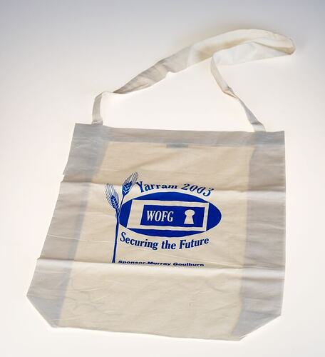 A key feature that unites all Victorian Women on Farms Gatherings is the tradition of giving gifts and souvenirs to participants. These gifts are usually sourced from the region that the Gathering is held and include local foodstuffs, pamphlets and handcrafted goods. They are usually handed to participants at the beginning of the Gathering during registration, and are often contained within a bag, such as this 2003 Yarram Gathering bag. This tradition of gift-giving allows the local organising committee to showcase their region's produce, as well as to make their guests feel welcome from the outset of the Gathering weekend.