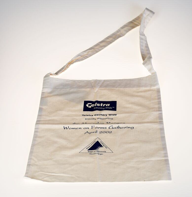 Cloth carry bag used by delegates at the 2002 Macedon Ranges (Kyneton) Women on Farms Gathering. This bag was given to participants at the beginning of the Gathering during registration and contained a range of local pamphlets, tourist information and samples of regional produce.