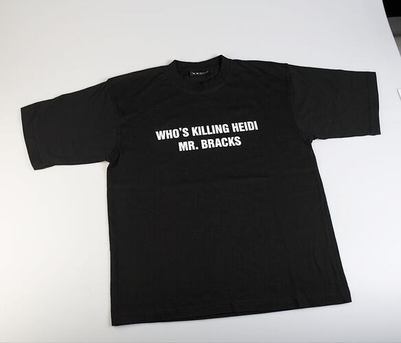 Text, front of shirt: 'WHO'S KILLING HEIDI/MR. BRACKS.'