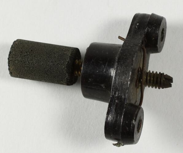 A black cylindrical piece of bonded iron dust attached to a screw which is inserted into a plastic bracket.
