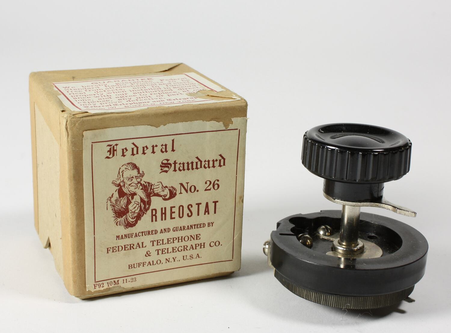Rheostat: " FEDERAL No. 26 " Box labels: "Federal / Standard / No. 26 / RHEOSTAT / MANUFACTURED AND GUARANTEED BY / FEDERAL TELEPHONE / & TELEGRAPH CO. / BUFFALO. N.Y., U.S.A. ", "GUARANTEE / We hereby guarantee Federal / Standard Radio Products to be / free from all mechanical and elect- / rical defects, and to function / properly when installed in accord-ance with our authorized direct- / ions, and agree to replace, at our / expense, any unit or part [illegible] / may prove defective. / Federal Telephone and Telegrap[illegible] / Form 297 BUFFALO, NEW YORK "