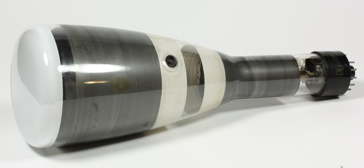 Conical glass bulb with tubular neck. Phosphor coated screen at the wide end and diheptal bakelite base with 12 pins present at the end of the tubular section. The inside of the bulb has two areas coated with graphite with two bands of a light coloured material separated by about 25 mm on the facing edges of the graphite coated areas. A recessed connector allows connection to the coating nearest the screen.