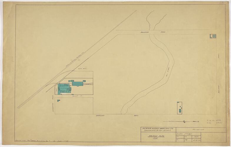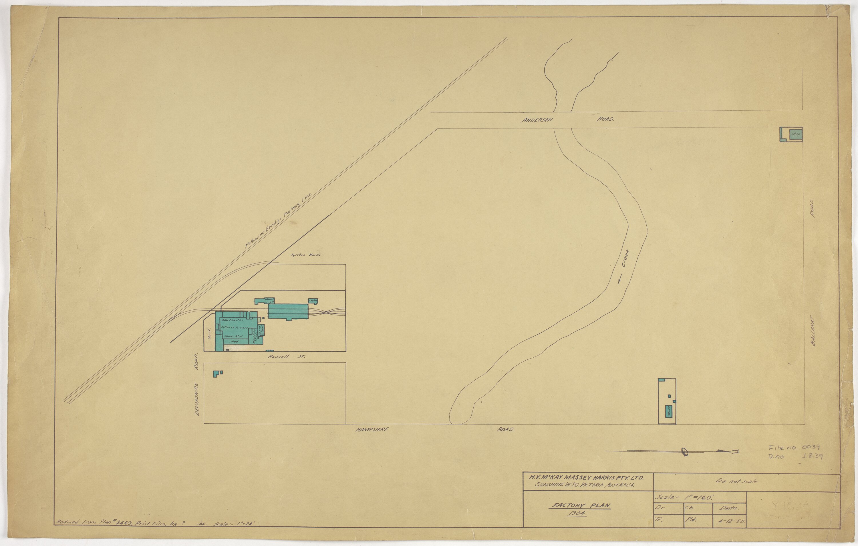 Printed in black in lower edge of page: " Reduced from Plan #2469, Print Files by ? -04 Scale 1'=20' / H.V. McKAY MASSEY HARRIS PTY. LTD. / SUNSHINE, W 20, VICTORIA. AUSTRALIA. / FACTORY PLAN / 1904 / Scale 1"=160' / DATE 4-12-50 / Y169 A / Const. Eng. / File No. 00039 / D.No. J.8.39"