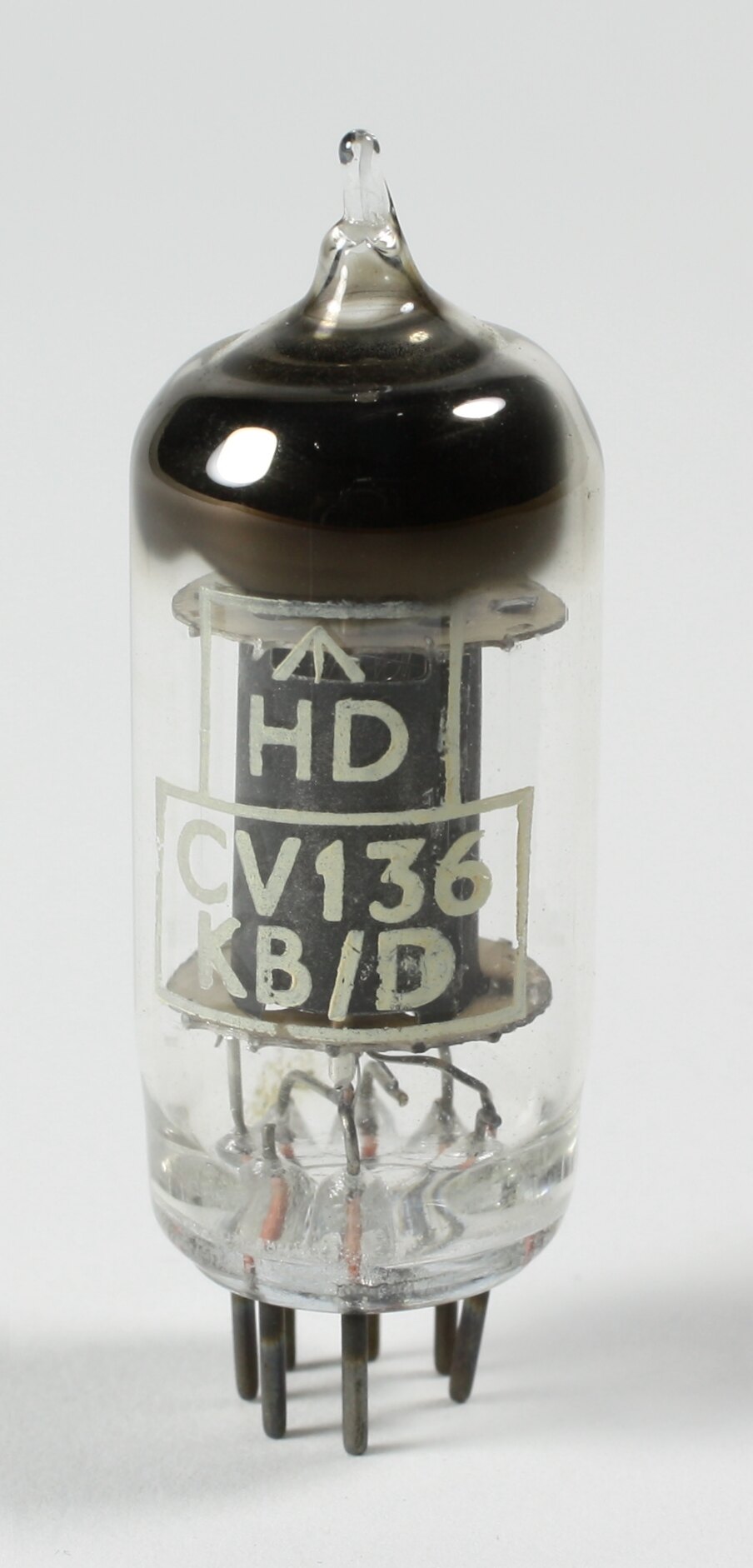 Cylindrical glass bulb with exhaust tip on top with miniature seven pin base.