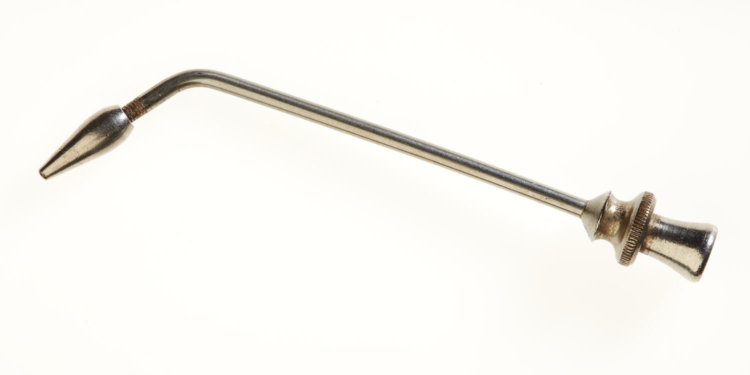 Long narrow stainless steel tube with a curved tip and removable nozzle. The other end is shaped and has a narrow knurled ring.