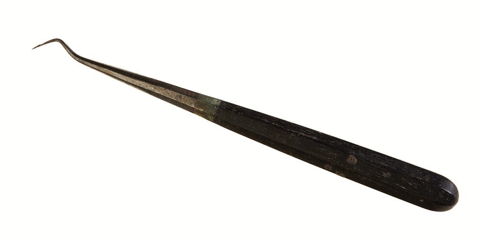 Thin stainless steel instrument with a fine curved point at one end. The wooden octagonal end of the instrument acts as a grip handle.