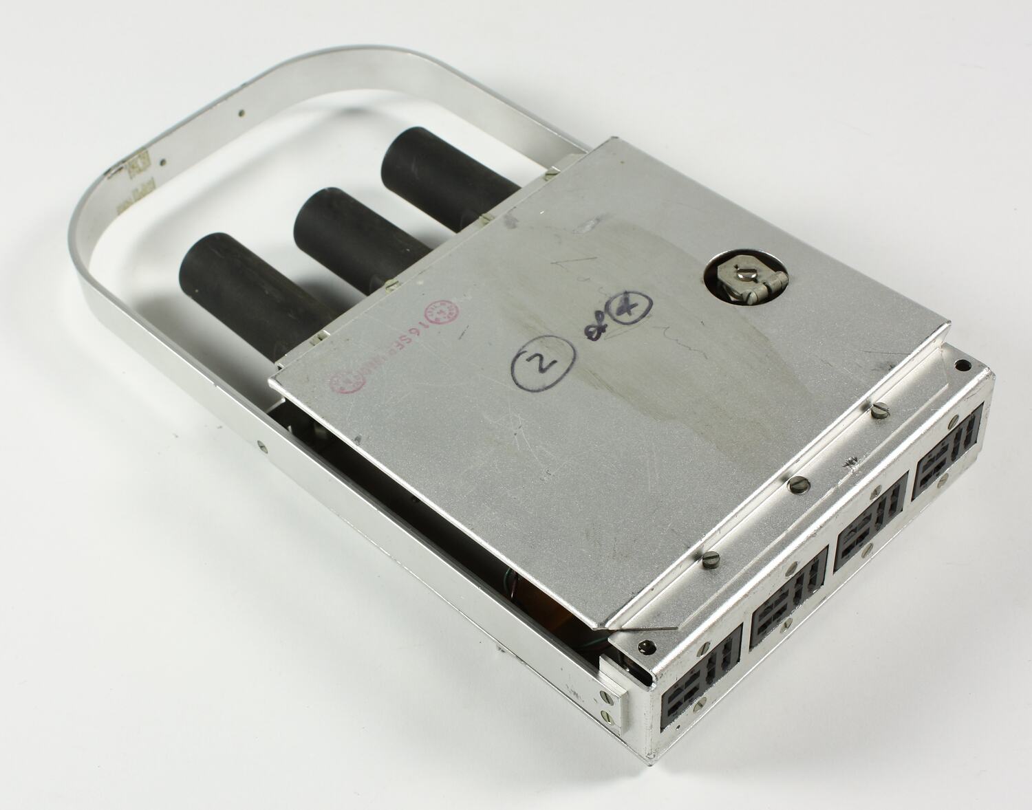 A printed circuit board inside a square shaped aluminium housing with a curved metal handle. There are three electronic valves on top of the housing. There is a red stamp on one side, text in black marker pen and in pencil. There is a manufacturer's plate on the end of the handle and some handwritten text. A number is stamped inside the housing (visible without opening the box). There are four 8-socket "Jones type" connectors in the base of the unit.