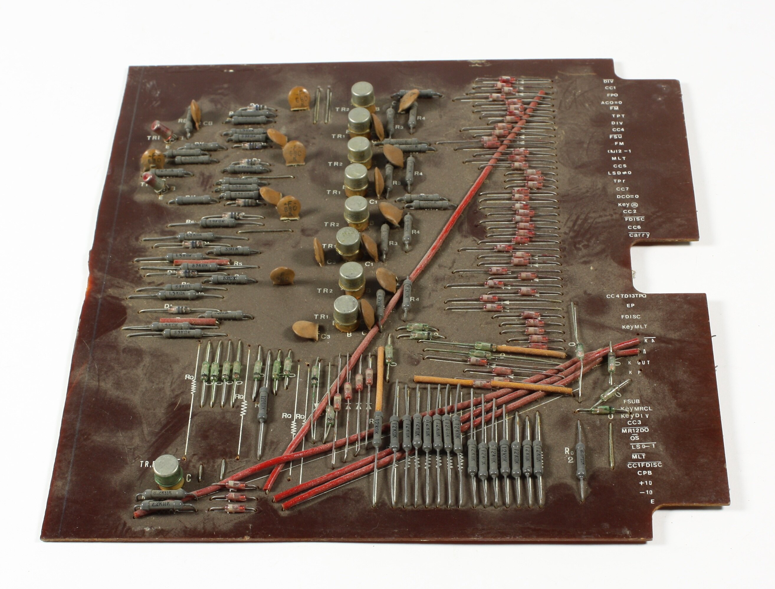 A printed circuit board (1960s) with diodes, resistors, capacitors and transistors. The board is possibly a spare for an unidentified computer or machine.