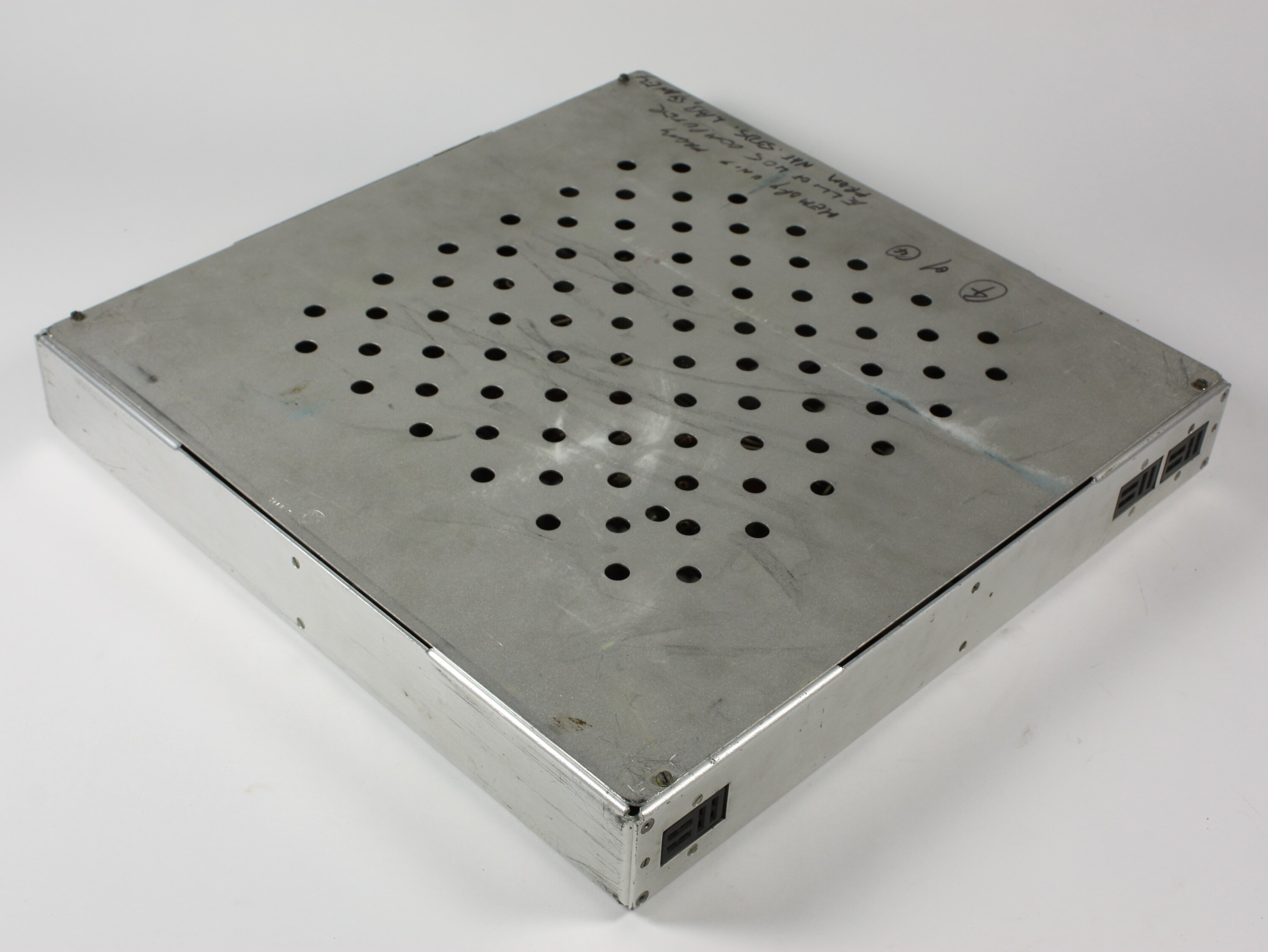 A circuit board with four valves and various electronic components inside a square shaped aluminium housing with holes in two sides. There are 8 fine wires strung around a circular support disc inside the unit. There is a manufacturer's plate on one side of the unit and handwritten text in pencil, blue pen and black marker pen. There is a small stamped number on one side. There are three 8-socket "Jones type" connectors in one end of the unit.